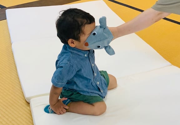 まずは縫わずにできる簡単タオル人形作り!このお人形を使って親子で出来る触れ合いリズム遊びを楽しみました。