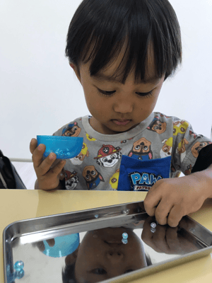 マラカスの作り方はとっても簡単‼️ガチャポンケースにビーズを入れてプラスチックスプーンで持ち手をつけます。