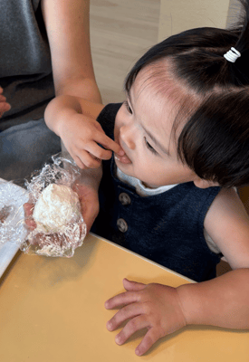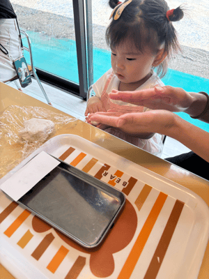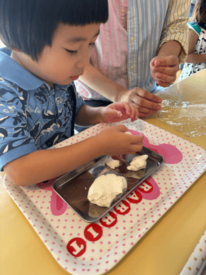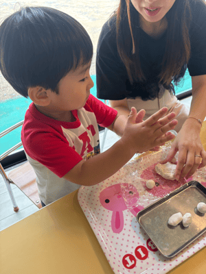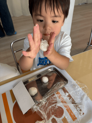 おだんごをこねこね、まるまる、伸ばしてみたり、お口にいれてみたり、感触遊びを楽しみました。