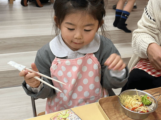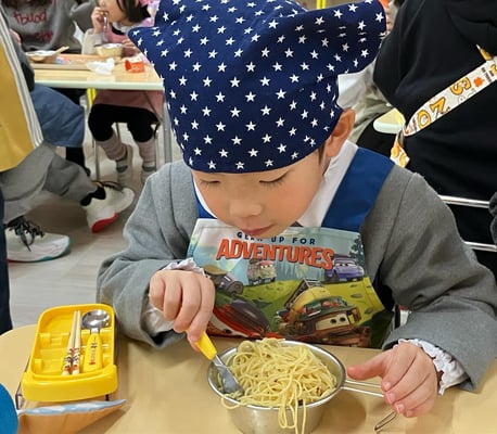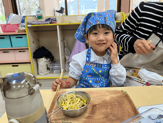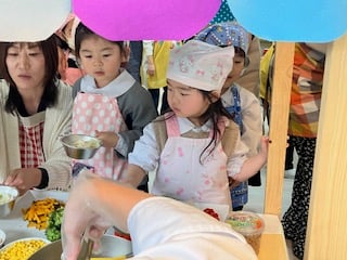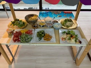 ブッフェスタイルで好きなお野菜やパスタをシェラカップに入れ1人ひとりオリジナルの『大冒険サラダ』を作りました。